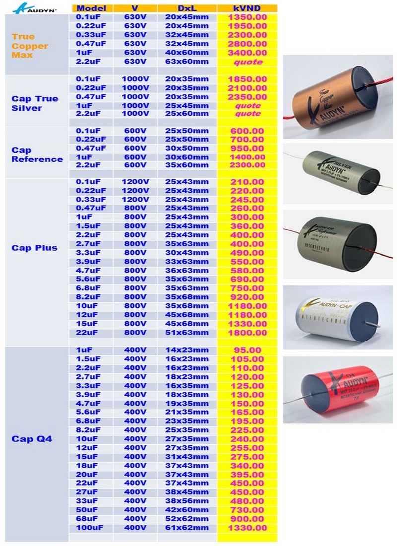 A Very high-end capacitor should be absolutely neutral and should let the audio signal flow without distortion. The Audyn True Copper Max Cap gives an open neutral sound; a truly accurate and honest reproduction. Suitable for loudspeaker and pre-amplifier and amplifier signal application.