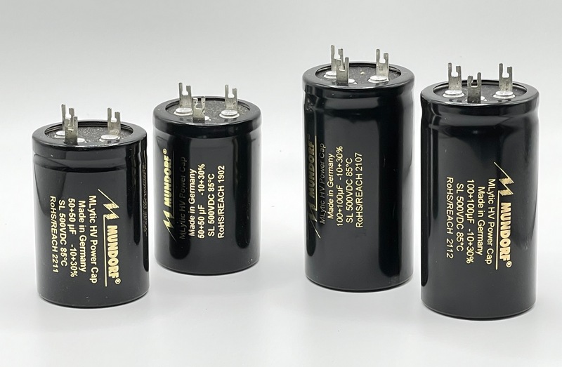The MLytic® HV electrolytic capacitors have been developed from the latest materials and modern manufacturing techniques to provide high standard reservoir capacitor that can easily deal with the challenges of tube amplifiers. They offer two capacitors in one can, both capacitors sharing the same negative terminal. By joining the positive terminals together you effectively double the capacitance.